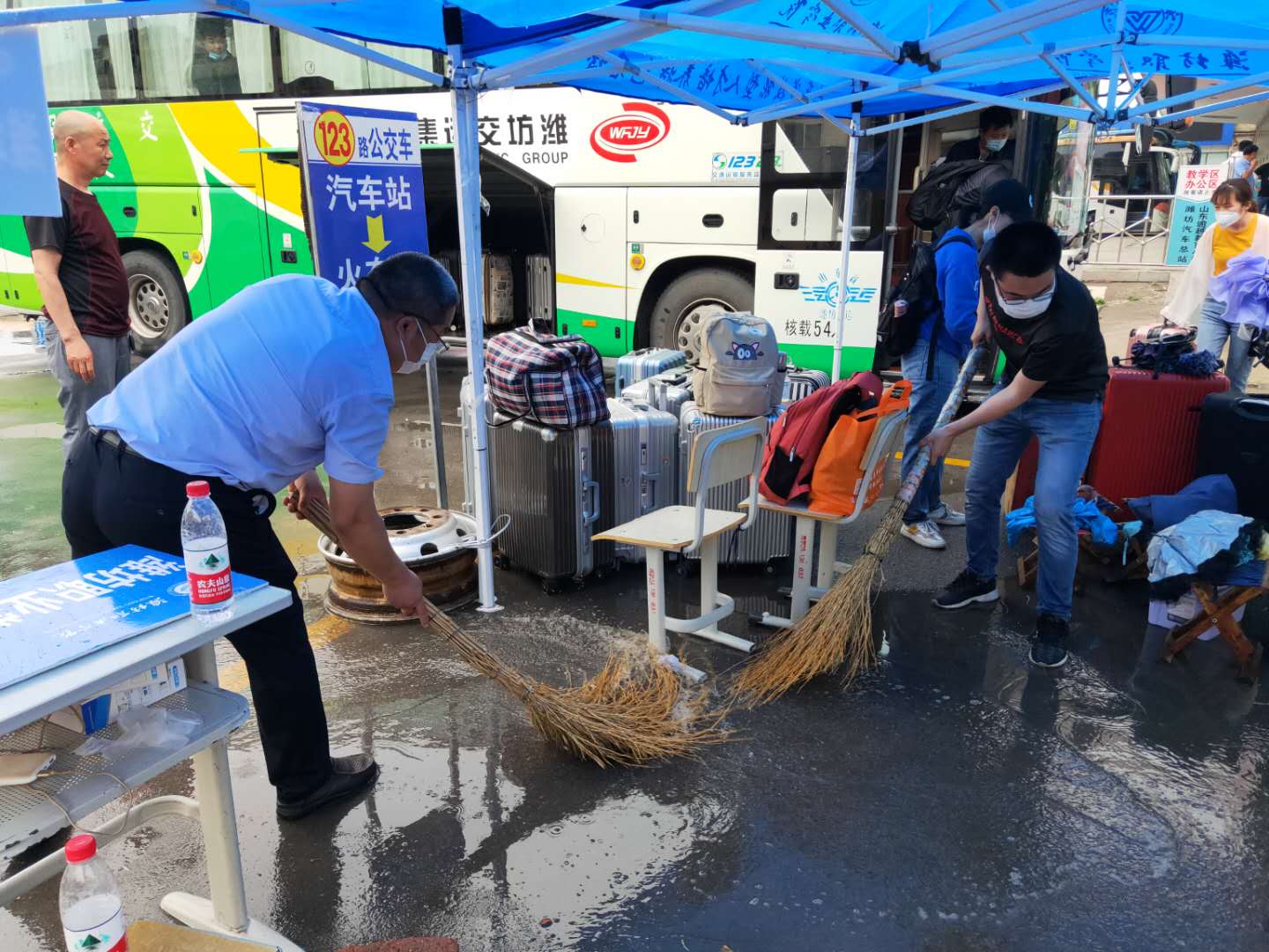 为做好校园防控及学生顺利返校工作,23日早上六点半,由教师组成的服务队伍已经做好准备,分别在汽车总站和学校南门静待学生归来。“请同学们测量体温,保持一米间距!”各个流程环节的工作人员有序组织学生进行行李消杀、体温检测、信息登记、领取通行卡等各项工作,同学们有序进入校园,完成返校报到手续后,乘坐学校安排的摆渡车回到宿舍。学校还安排教师志愿者分赴汽车总站做好接站工作。